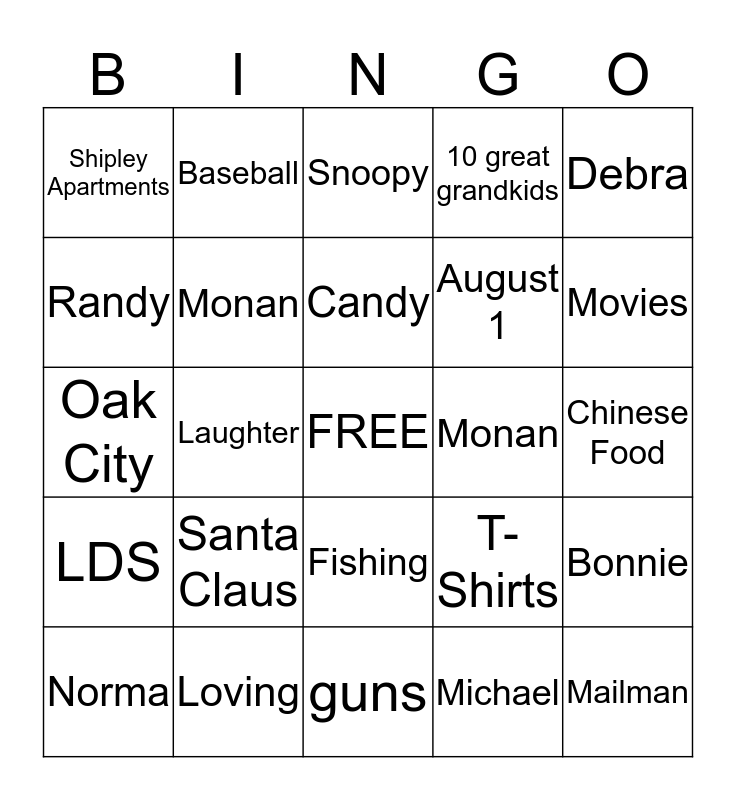 This bingo card has a free space and 24 words: Santa Claus, Loving, Candy, Norma, Debra, Shipley Apartments, Randy, Baseball, Monan, Fishing, August 1, Oak City, T-Shirts, Bonnie, Monan, Michael, Chinese Food, Snoopy, Movies, Laughter, Mailman, LDS, 10 great grandkids and guns.