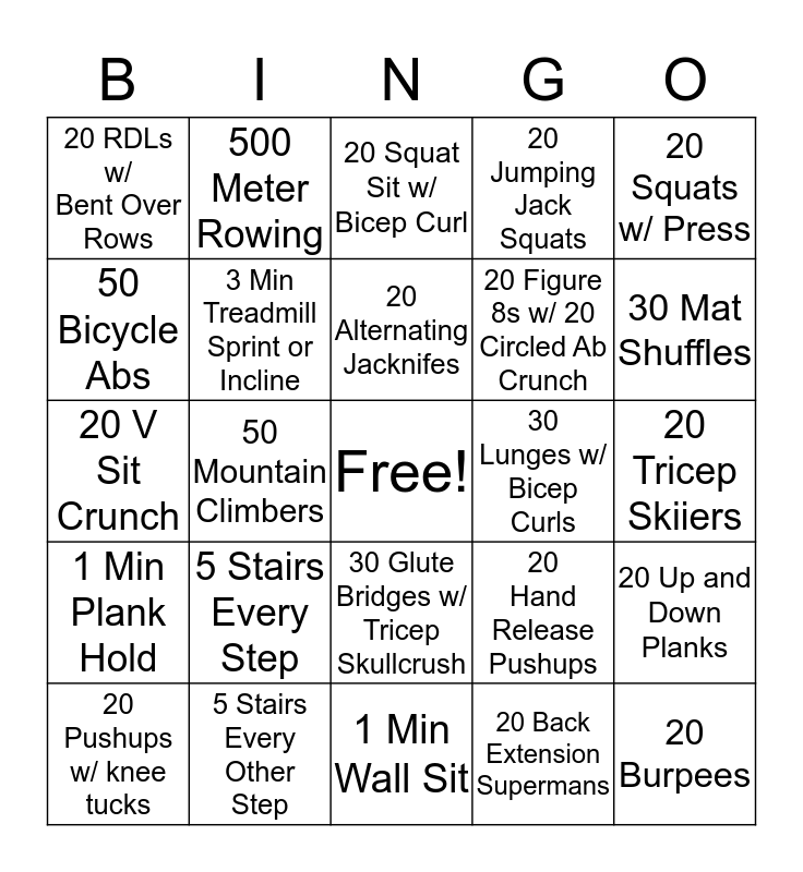 This bingo card has a free space and 24 words: 5 Stairs Every Step, 5 Stairs Every Other Step, 20 Alternating Jacknifes, 20 Pushups w/ knee tucks, 20 Squats w/ Press, 20 RDLs w/ Bent Over Rows, 50 Bicycle Abs, 500 Meter Rowing, 30 Lunges w/ Bicep Curls, 30 Glute Bridges w/ Tricep Skullcrush, 20 Figure 8s w/ 20 Circled Ab Crunch, 20 V Sit Crunch, 20 Hand Release Pushups, 20 Up and Down Planks, 3 Min Treadmill Sprint or Incline, 20 Back Extension Supermans, 20 Tricep Skiiers, 20 Squat Sit w/ Bicep Curl, 30 Mat Shuffles, 50 Mountain Climbers, 20 Burpees, 1 Min Plank Hold, 20 Jumping Jack Squats and 1 Min Wall Sit.