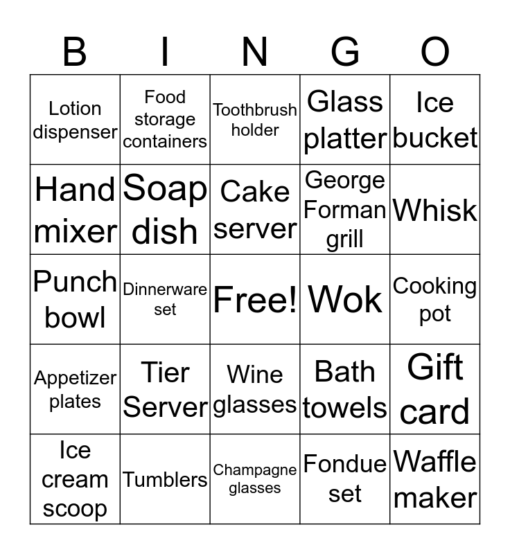 This bingo card has a free space and 31 words: Champagne glasses, Pitcher, Dinnerware set, Picture frame, Lotion dispenser, Toothbrush holder, Soap dish, Bath towels, Wok, Fondue set, Cooking pot, Waffle maker, Blender, Slow cooker, Whisk, Spice rack, Gift card, Tier Server, Appetizer plates, Wine glasses, Ice bucket, Pie pan, Ice cream scoop, Food storage containers, George Forman grill, Hand mixer, Glass platter, Punch bowl, Tumblers, Cake server and Wine.