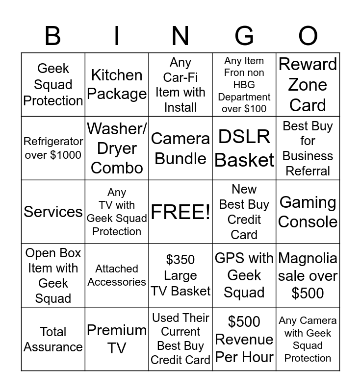 This bingo card has a free space and 24 words: Attached Accessories, Premium TV, Camera Bundle, Total Assurance, Reward Zone Card, Geek Squad Protection, Refrigerator over $1000, Kitchen Package, New Best Buy Credit Card, $350 Large TV Basket, DSLR Basket, Services, GPS with Geek Squad, Magnolia sale over $500, Washer/ Dryer Combo, $500 Revenue Per Hour, Gaming Console, Any Car-Fi Item with Install, Best Buy for Business Referral, Any TV with Geek Squad Protection, Any Camera with Geek Squad Protection, Open Box Item with Geek Squad, Any Item Fron non HBG Department over $100 and Used Their Current Best Buy Credit Card.
