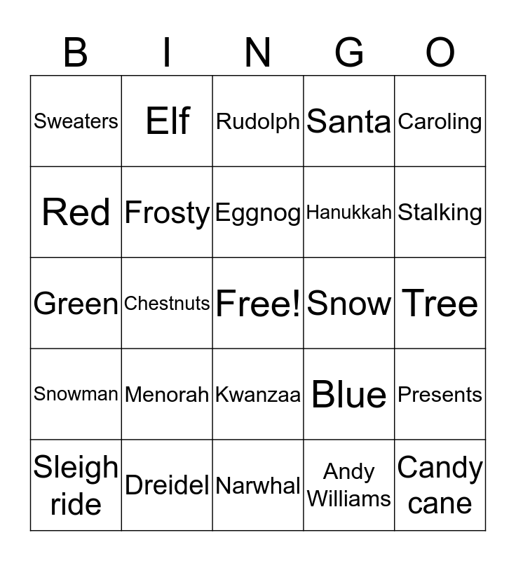This bingo card has a free space and 24 words: Menorah, Dreidel, Eggnog, Sleigh ride, Caroling, Sweaters, Red, Elf, Snow, Kwanzaa, Hanukkah, Green, Blue, Presents, Frosty, Andy Williams, Tree, Rudolph, Stalking, Chestnuts, Candy cane, Snowman, Santa and Narwhal.