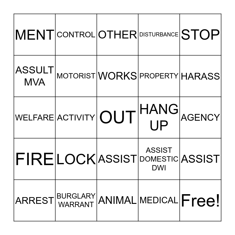 This bingo card has 36 words: BROAD, CAST, INFOMATIO, MOTORIST, ASSIST DOMESTIC DWI, FIRE, WORKS, TRAFFIC, STOP, STEALING PEDESTRACHECK SUSPICIOU, ACTIVITY, DISTURBANCE, 911, HANG UP, HARASS, MENT, Free!, LOCK, OUT, OTHER, AGENCY, ASSIST, BURGLARY WARRANT, ARREST, ANIMAL, CONTROL, WELFARE, CHECK ALARM, PROPERTY, ASSULT MVA, FOUND, PROPERTY, MEDICAL, ASSIST, NOISE and COMPLAIN.