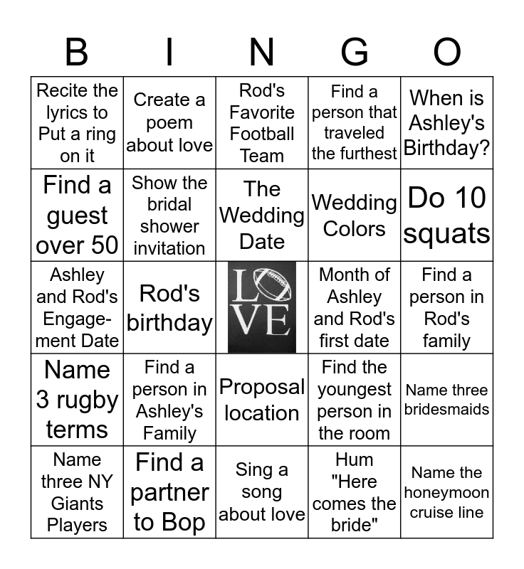 This bingo card has a free space and 24 words: Find a person in Ashley's Family, Find a partner to Bop, The Wedding Date, Name three NY Giants Players, When is Ashley's Birthday?, Recite the lyrics to Put a ring on it, Find a guest over 50, Create a poem about love, Month of Ashley and Rod's first date, Proposal location, Wedding Colors, Ashley and Rod's Engage-ment Date, Find the youngest person in the room, Name three bridesmaids, Show the bridal shower invitation, Hum "Here comes the bride", Find a person in Rod's family, Rod's Favorite Football Team, Do 10 squats, Rod's birthday, Name the honeymoon cruise line, Name 3 rugby terms, Find a person that traveled the furthest and Sing a song about love.