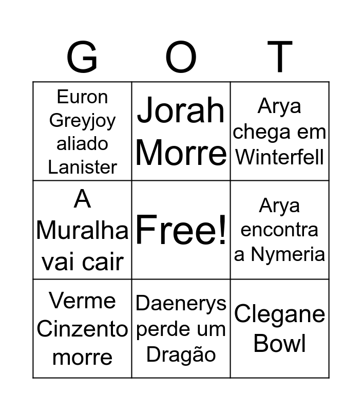 This bingo card has a free space and 8 words: Arya encontra a Nymeria, Arya chega em Winterfell, Jorah Morre, Verme Cinzento morre, Euron Greyjoy aliado Lanister, Clegane Bowl, A Muralha vai cair and Daenerys perde um Dragão.