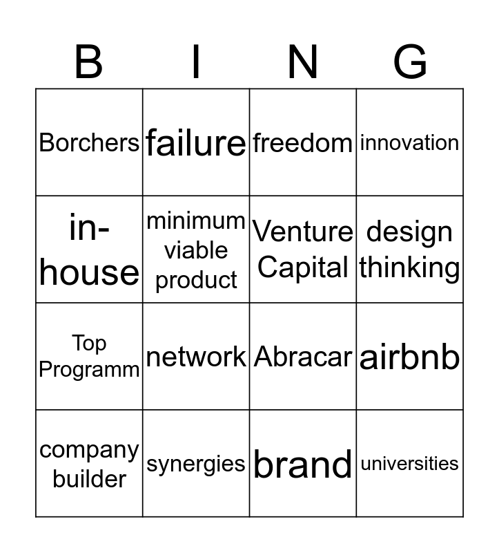 This bingo card has 16 words: company builder, synergies, freedom, innovation, in-house, failure, Abracar, airbnb, Borchers, minimum viable product, brand, design thinking, Top Programm, network, Venture Capital and universities.
