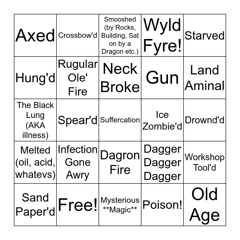 This bingo card has 30 words: Free!, Swoard, Spear'd, Arrow'ed, Axed, Smooshed (by Rocks, Building, Sat on by a Dragon etc.), Rugular Ole' Fire, Dagron Fire, Ice Zombie'd, Mysterious **Magic**, Drownd'd, Suffercation, Poison!, Old Age, Land Aminal, Sea Creture, Dagger Dagger Dagger, Melted (oil, acid, whatevs), Infection Gone Awry, Starved, The Black Lung (AKA illness), Moon Door Trust Fall (falling from a great height), Crossbow'd, Gun, Hung'd, Wyld Fyre!, Workshop Tool'd, Sand Paper'd, Neck Broke and Eat'd by Dragans.