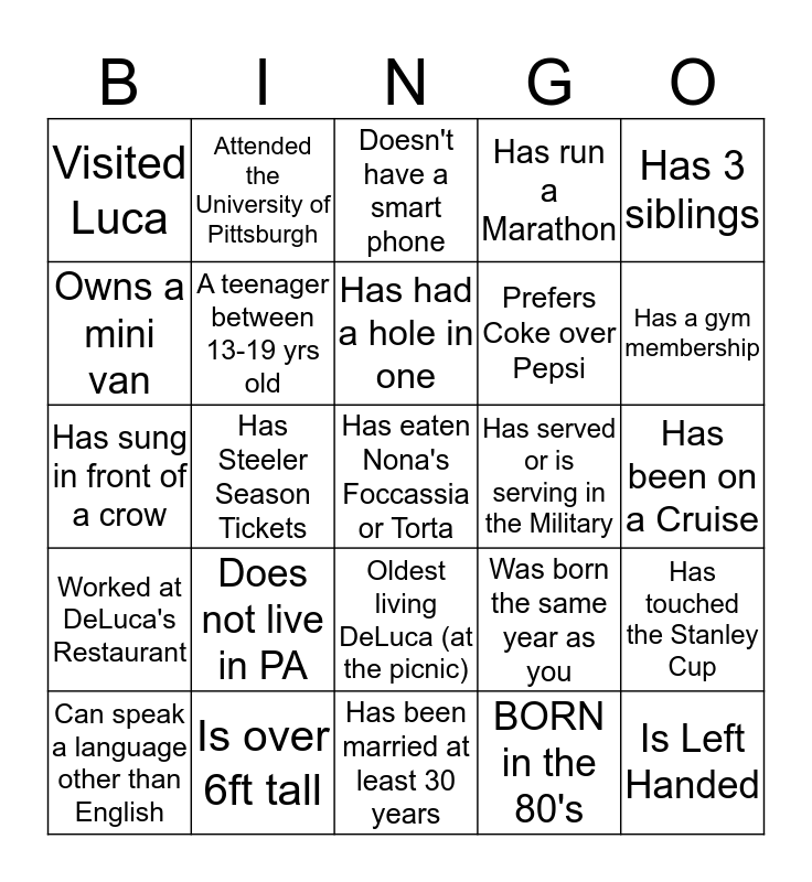 This bingo card has a free space and 24 words: Does not live in PA, Is over 6ft tall, Has had a hole in one, Can speak a language other than English, Has 3 siblings, Visited Luca, Owns a mini van, Attended the University of Pittsburgh, Has served or is serving in the Military, Oldest living DeLuca (at the picnic), Prefers Coke over Pepsi, Has sung in front of a crow, Was born the same year as you, Has touched the Stanley Cup, A teenager between 13-19 yrs old, BORN in the 80's, Has been on a Cruise, Doesn't have a smart phone, Has a gym membership, Has Steeler Season Tickets, Is Left Handed, Worked at DeLuca's Restaurant, Has run a Marathon and Has been married at least 30 years.