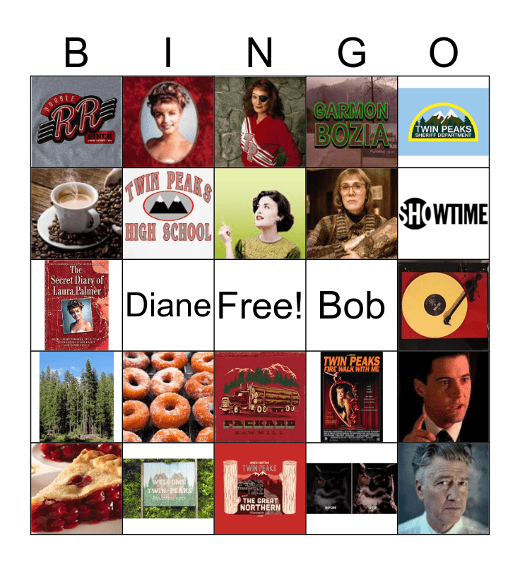 This bingo card has 22 images, a free space and 2 words: Bob and Diane.