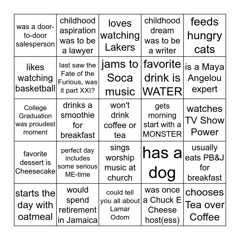 This bingo card has 28 words: usually eats PB&J for breakfast, accidentally played footsie w/father instead of hubby, favorite drink is WATER, was once a Chuck E Cheese host(ess), likes watching basketball, loves watching Lakers, childhood aspiration was to be a lawyer, favorite dessert is Cheesecake, gets morning start with a MONSTER, starts the day with oatmeal, College Graduation was proudest moment, childhood dream was to be a writer, would spend retirement in Jamaica, could tell you all about Lamar Odom, is a Maya Angelou expert, perfect day includes some PS4, perfect day includes some serious ME-time, last saw the Fate of the Furious, was it part XXI?, jams to Soca music, sings worship music at church, was a door-to-door salesperson, chooses Tea over Coffee, won't drink coffee or tea, drinks a smoothie for breakfast, watches TV Show Power, has a dog, feeds hungry cats and face is not on Facebook.