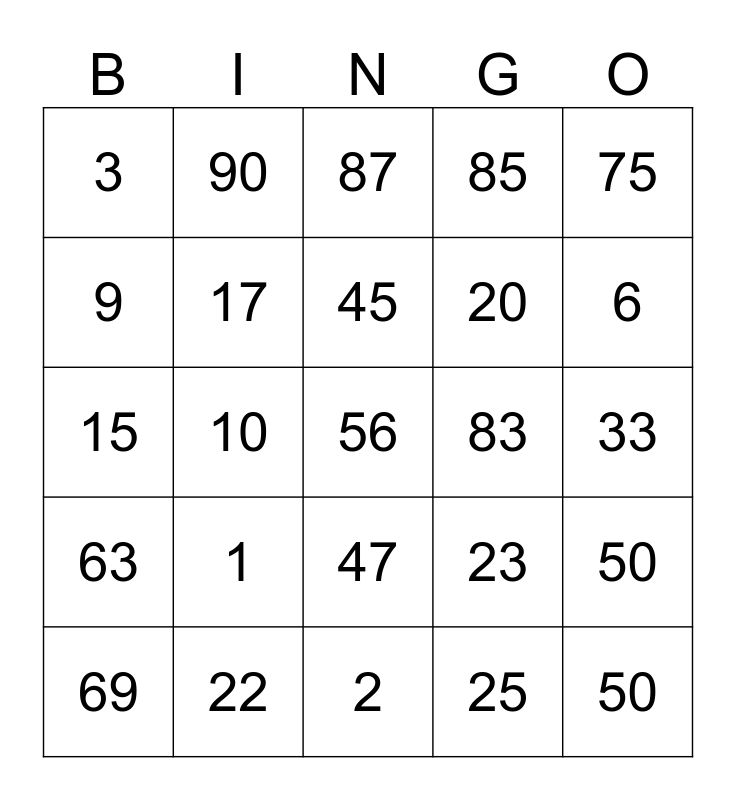 This bingo card has a free space and 24 words: 1, 22, 45, 69, 75, 3, 9, 90, 83, 47, 20, 15, 23, 50, 17, 25, 33, 87, 6, 10, 50, 63, 85 and 2.