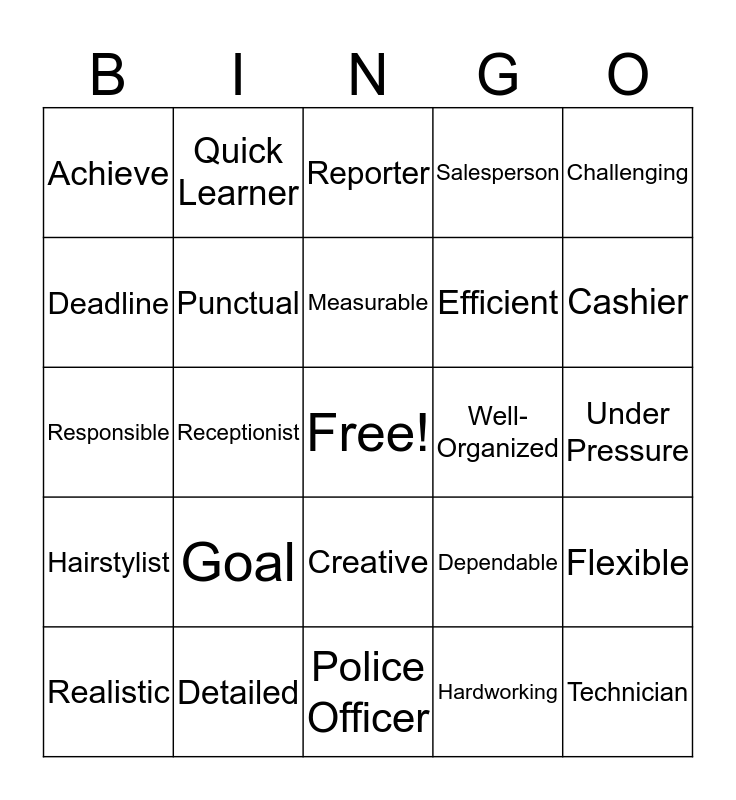 This bingo card has a free space and 24 words: Goal, Detailed, Measurable, Realistic, Challenging, Achieve, Deadline, Quick Learner, Well- Organized, Creative, Efficient, Responsible, Dependable, Flexible, Punctual, Hardworking, Under Pressure, Reporter, Cashier, Receptionist, Technician, Hairstylist, Salesperson and Police Officer.