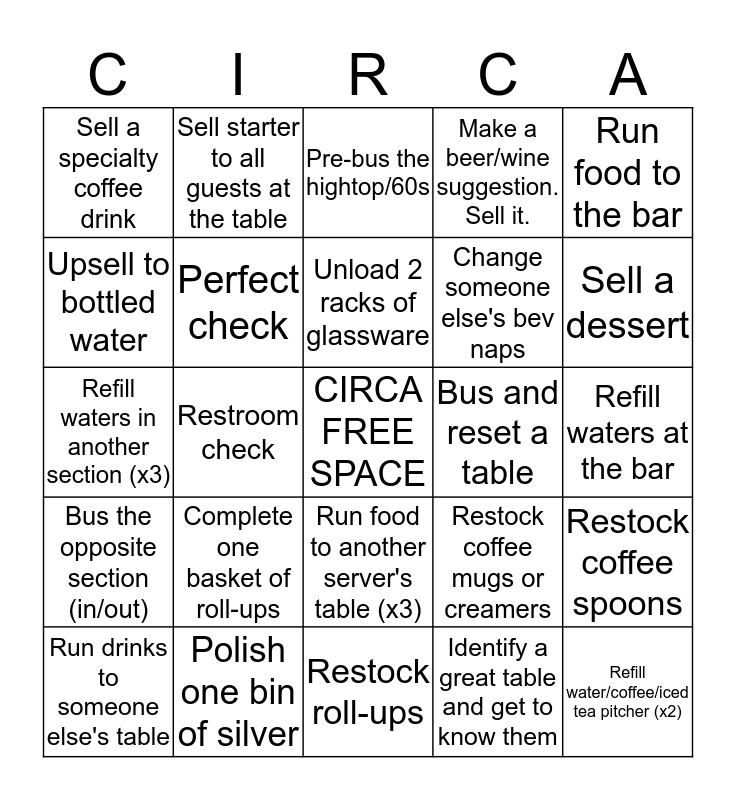 This bingo card has a free space and 24 words: Complete one basket of roll-ups, Polish one bin of silver, Unload 2 racks of glassware, Run drinks to someone else's table, Run food to the bar, Sell a specialty coffee drink, Upsell to bottled water, Sell starter to all guests at the table, Bus and reset a table, Run food to another server's table (x3), Change someone else's bev naps, Refill waters in another section (x3), Restock coffee mugs or creamers, Restock coffee spoons, Perfect check, Identify a great table and get to know them, Refill waters at the bar, Pre-bus the hightop/60s, Sell a dessert, Restroom check, Refill water/coffee/iced tea pitcher (x2), Bus the opposite section (in/out), Make a beer/wine suggestion. Sell it. and Restock roll-ups.