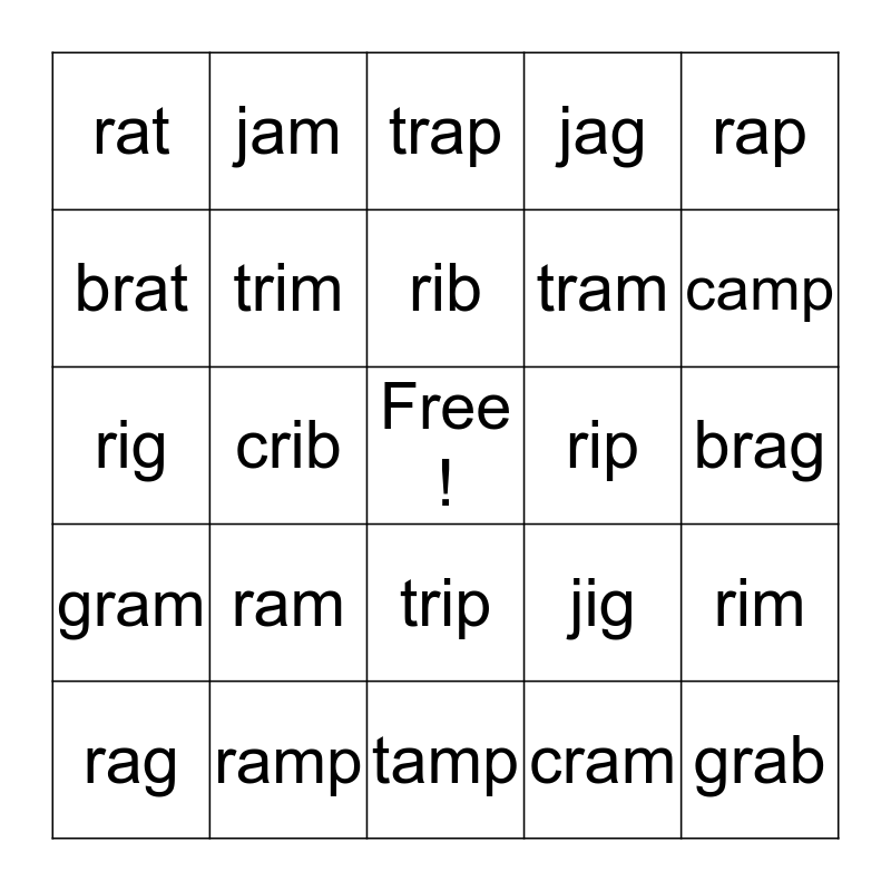 This bingo card has a free space and 24 words: ram, ramp, rib, rag, rap, rat, brat, jam, rip, trip, tram, rig, jig, rim, trim, cram, brag, trap, camp, crib, grab, gram, jag and tamp.