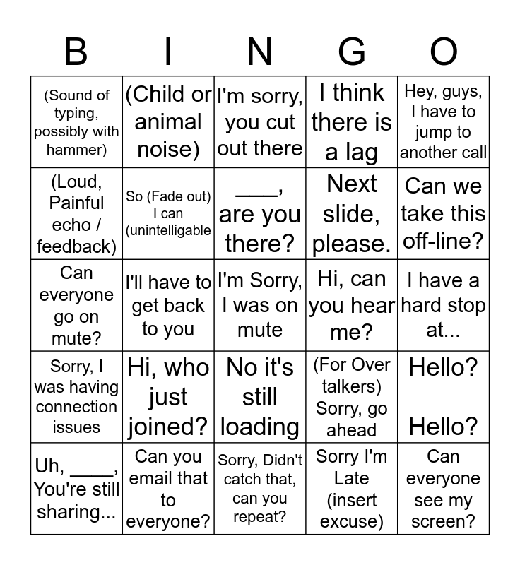 This bingo card has a free space and 24 words: Hi, who just joined?, Can you email that to everyone?, ___, are you there?, Uh, ____, You're still sharing..., Hey, guys, I have to jump to another call, (Sound of typing, possibly with hammer), (Loud, Painful echo / feedback), (Child or animal noise), Hi, can you hear me?, No it's still loading, Next slide, please., Can everyone go on mute?, (For Over talkers) Sorry, go ahead, Hello? Hello?, So (Fade out) I can (unintelligable, Sorry I'm Late (insert excuse), I have a hard stop at..., I'm sorry, you cut out there, Can we take this off-line?, I'll have to get back to you, Can everyone see my screen?, Sorry, I was having connection issues, I think there is a lag and Sorry, Didn't catch that, can you repeat?.