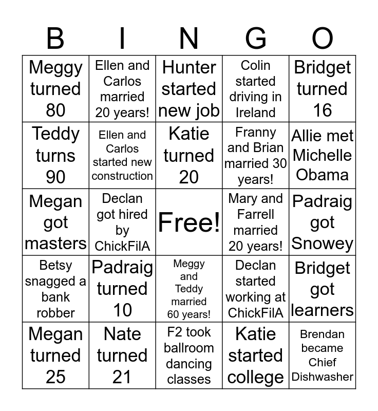 This bingo card has a free space and 24 words: Padraig turned 10, Nate turned 21, Katie turned 20, Megan turned 25, Bridget turned 16, Meggy turned 80, Teddy turns 90, Ellen and Carlos married 20 years!, Mary and Farrell married 20 years!, Meggy and Teddy married 60 years!, Franny and Brian married 30 years!, Megan got masters, Declan started working at ChickFilA, Bridget got learners, Ellen and Carlos started new construction, Katie started college, Padraig got Snowey, Hunter started new job, Allie met Michelle Obama, Declan got hired by ChickFilA, Brendan became Chief Dishwasher, Betsy snagged a bank robber, Colin started driving in Ireland and F2 took ballroom dancing classes.