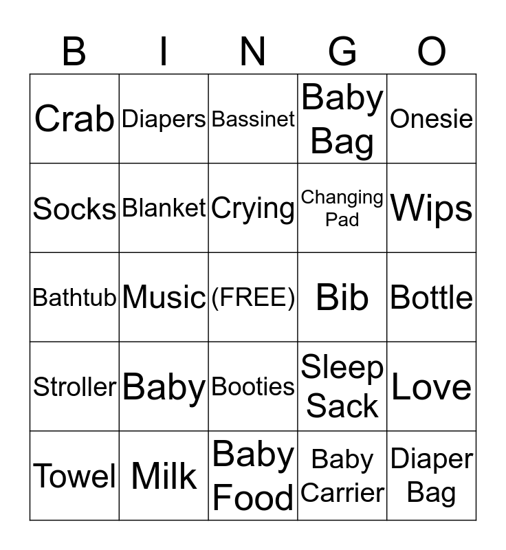 This bingo card has a free space and 24 words: Baby, Milk, Crying, Towel, Onesie, Crab, Socks, Diapers, Bib, Booties, Changing Pad, Bathtub, Sleep Sack, Love, Blanket, Baby Carrier, Bottle, Bassinet, Wips, Music, Diaper Bag, Stroller, Baby Bag and Baby Food.
