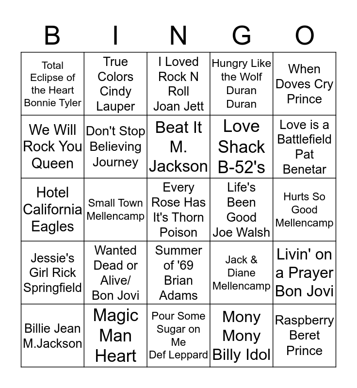 This bingo card has 25 words: Wanted Dead or Alive/ Bon Jovi, Pour Some Sugar on Me Def Leppard, Beat It M. Jackson, Billie Jean M.Jackson, When Doves Cry Prince, Total Eclipse of the Heart Bonnie Tyler, We Will Rock You Queen, True Colors Cindy Lauper, Life's Been Good Joe Walsh, Summer of '69 Brian Adams, Love Shack B-52's, Hotel California Eagles, Jack & Diane Mellencamp, Livin' on a Prayer Bon Jovi, Don't Stop Believing Journey, Raspberry Beret Prince, Hurts So Good Mellencamp, I Loved Rock N Roll Joan Jett, Love is a Battlefield Pat Benetar, Small Town Mellencamp, Every Rose Has It's Thorn Poison, Magic Man Heart, Jessie's Girl Rick Springfield, Hungry Like the Wolf Duran Duran and Mony Mony Billy Idol.