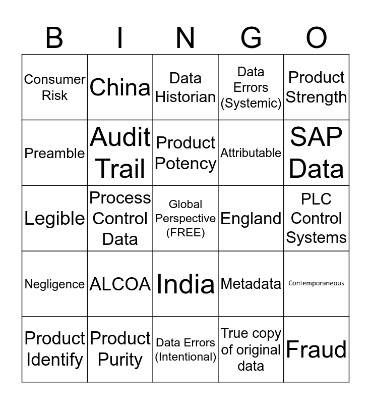 This bingo card has 1 images, a free space and 23 words: ALCOA, Product Purity, Product Potency, Product Identify, Product Strength, Consumer Risk, Preamble, China, England, India, Attributable, Legible, Metadata, Audit Trail, True copy of original data, PLC Control Systems, Data Historian, SAP Data, Process Control Data, Fraud, Negligence, Data Errors (Systemic) and Data Errors (Intentional).