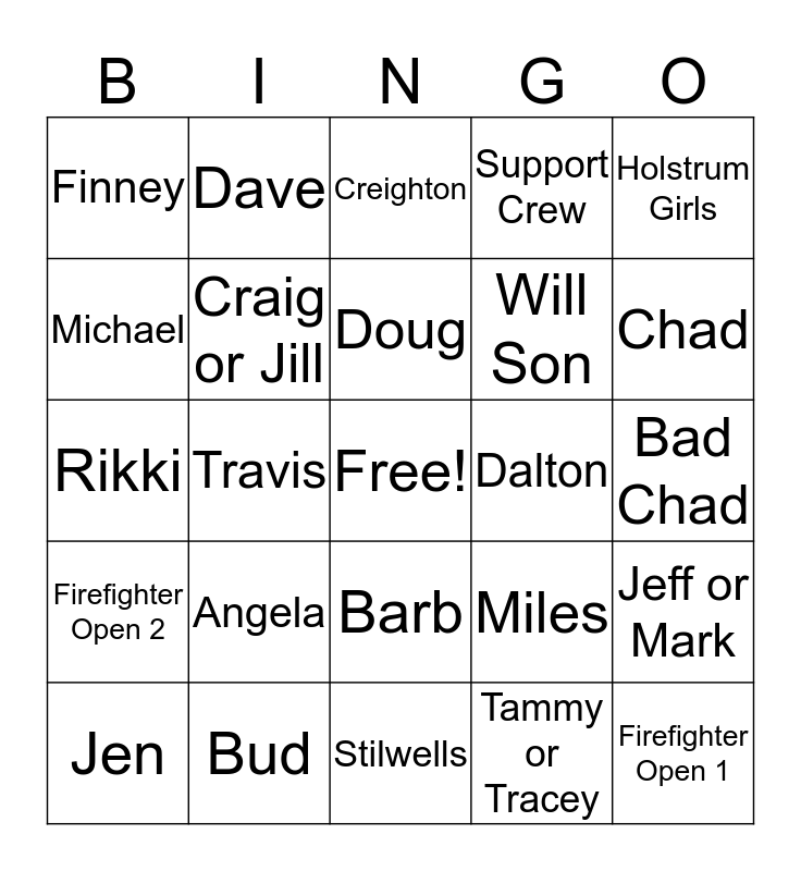 This bingo card has a free space and 24 words: Angela, Bud, Doug, Jen, Holstrum Girls, Finney, Michael, Dave, Dalton, Barb, Will Son, Rikki, Miles, Jeff or Mark, Craig or Jill, Tammy or Tracey, Bad Chad, Creighton, Chad, Travis, Firefighter Open 1, Firefighter Open 2, Support Crew and Stilwells.