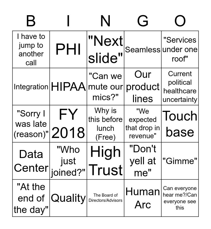 This bingo card has a free space and 24 words: "Who just joined?", Quality, "Can we mute our mics?", "At the end of the day", "Services under one roof", I have to jump to another call, Integration, PHI, "We expected that drop in revenue", High Trust, Our product lines, "Sorry I was late (reason)", "Don't yell at me", "Gimme", HIPAA, Human Arc, Touch base, "Next slide", Current political healthcare uncertainty, FY 2018, Can everyone hear me?/Can everyone see this, Data Center, Seamless and The Board of Directors/Advisors.