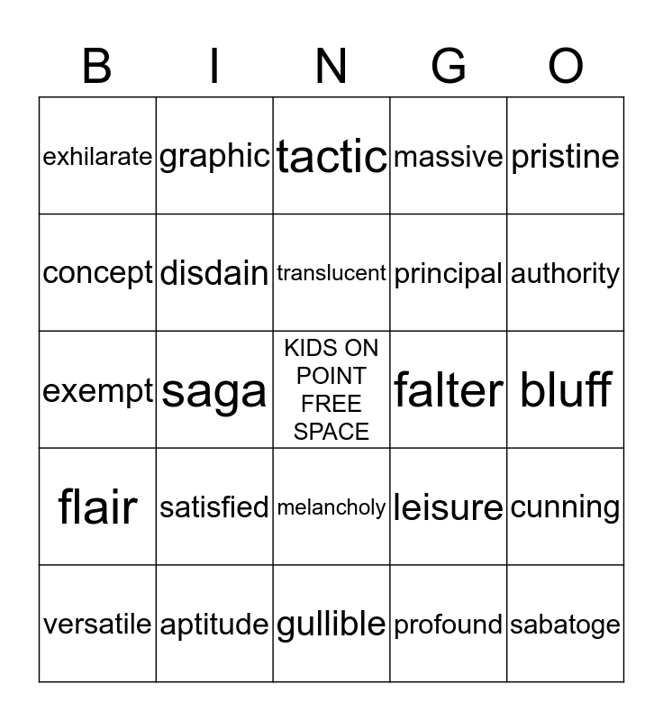 This bingo card has a free space and 24 words: satisfied, aptitude, translucent, versatile, pristine, exhilarate, concept, graphic, falter, melancholy, principal, exempt, leisure, cunning, disdain, profound, bluff, tactic, authority, saga, sabatoge, flair, massive and gullible.