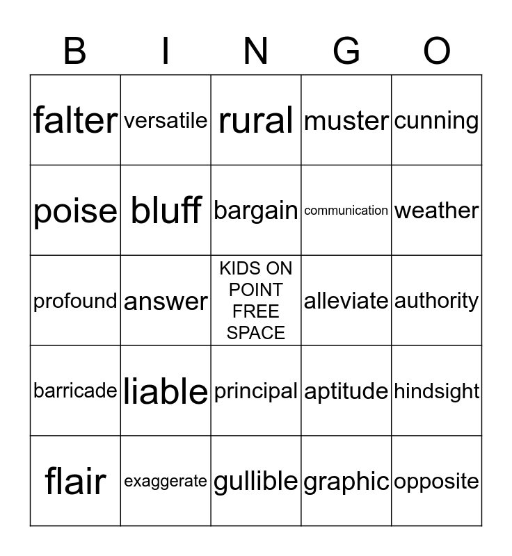 This bingo card has a free space and 24 words: liable, exaggerate, bargain, flair, cunning, falter, poise, versatile, alleviate, principal, communication, profound, aptitude, hindsight, bluff, graphic, authority, rural, weather, answer, opposite, barricade, muster and gullible.