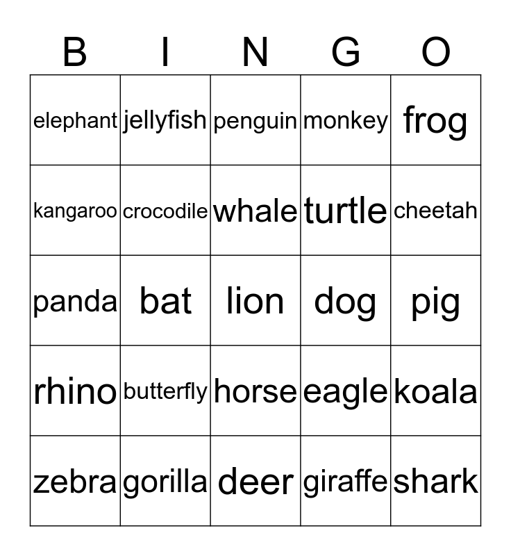 This bingo card has a free space and 24 words: butterfly, gorilla, whale, zebra, frog, elephant, kangaroo, jellyfish, dog, horse, turtle, panda, eagle, koala, crocodile, giraffe, pig, penguin, cheetah, bat, shark, rhino, monkey and deer.
