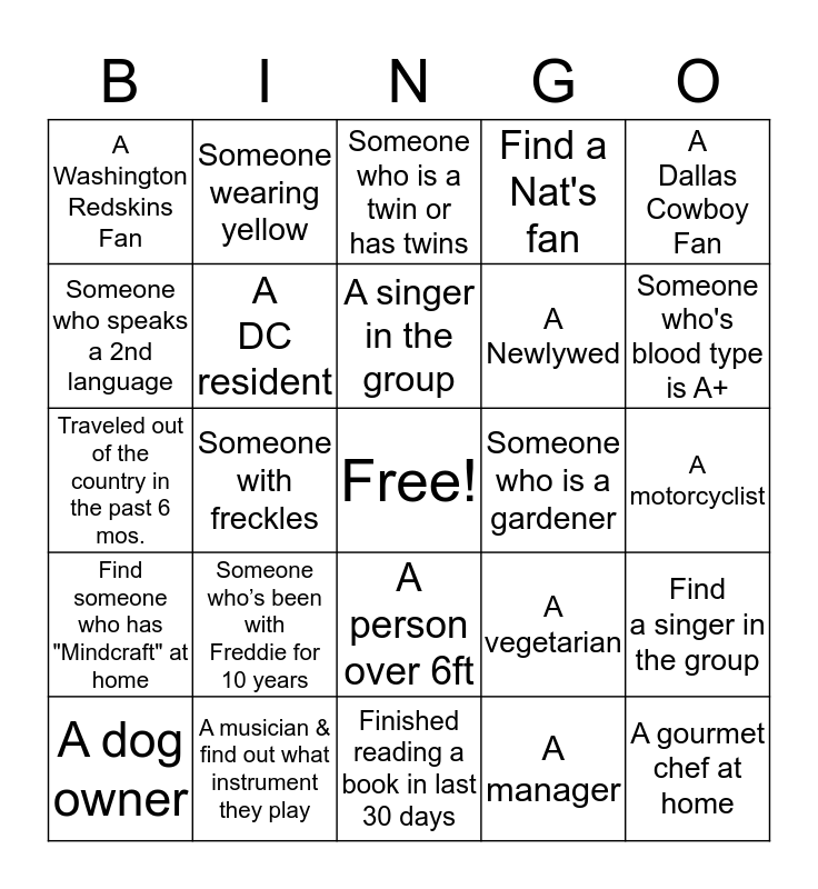 This bingo card has a free space and 24 words: Someone who’s been with Freddie for 10 years, A musician & find out what instrument they play, A singer in the group, A dog owner, A Dallas Cowboy Fan, A Washington Redskins Fan, Someone who speaks a 2nd language, Someone wearing yellow, Someone who is a gardener, A person over 6ft, A Newlywed, Traveled out of the country in the past 6 mos., A vegetarian, Find a singer in the group, A DC resident, A manager, A motorcyclist, Someone who is a twin or has twins, Someone who's blood type is A+, Someone with freckles, A gourmet chef at home, Find someone who has "Mindcraft" at home, Find a Nat's fan and Finished reading a book in last 30 days.