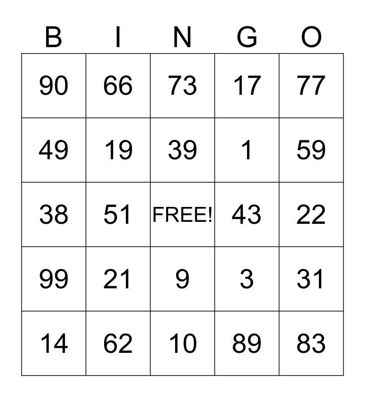 This bingo card has a free space and 24 words: 21, 62, 39, 14, 77, 90, 49, 66, 43, 9, 1, 38, 3, 31, 19, 89, 22, 73, 59, 51, 83, 99, 17 and 10.