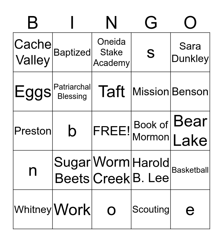 This bingo card has a free space and 24 words: Sugar Beets, Work, Taft, Whitney, Sara Dunkley, Cache Valley, Eggs, Baptized, Book of Mormon, Worm Creek, Mission, Preston, Harold B. Lee, Basketball, Patriarchal Blessing, Scouting, Bear Lake, Oneida Stake Academy, Benson, b, e, n, s and o.