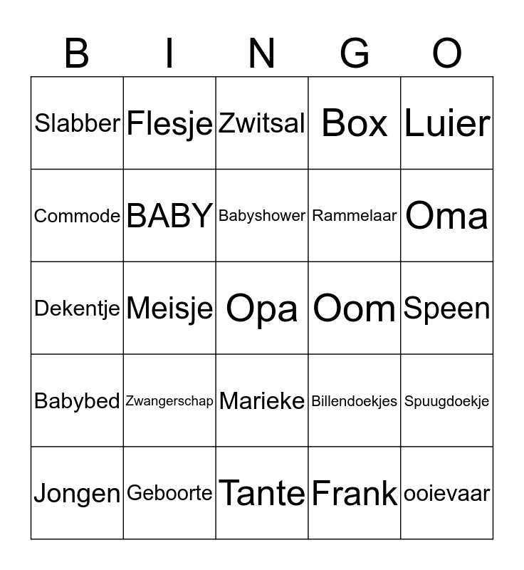 This bingo card has 26 words: Marieke, Frank, Babyshower, Geboorte, Luier, Slabber, Commode, Flesje, Speen, Billendoekjes, Rammelaar, Dekentje, Spuugdoekje, Jongen, Meisje, Knuffel, Box, Babybed, Zwitsal, Opa, Oma, Tante, Oom, Zwangerschap, BABY and ooievaar.