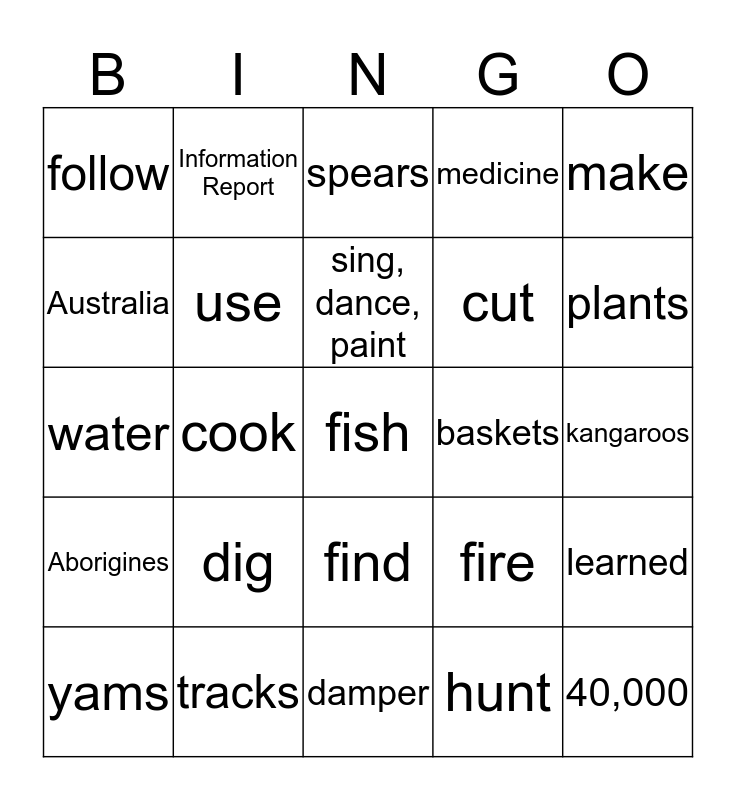 This bingo card has a free space and 24 words: dig, tracks, sing, dance, paint, yams, make, follow, Australia, Information Report, baskets, find, cut, water, fire, learned, use, hunt, kangaroos, spears, plants, cook, 40,000, Aborigines, medicine and damper.