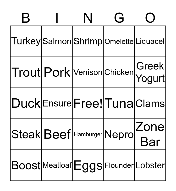 This bingo card has a free space and 24 words: Beef, Meatloaf, Venison, Boost, Liquacel, Turkey, Trout, Salmon, Tuna, Hamburger, Chicken, Duck, Nepro, Zone Bar, Pork, Flounder, Clams, Shrimp, Greek Yogurt, Ensure, Lobster, Steak, Omelette and Eggs.
