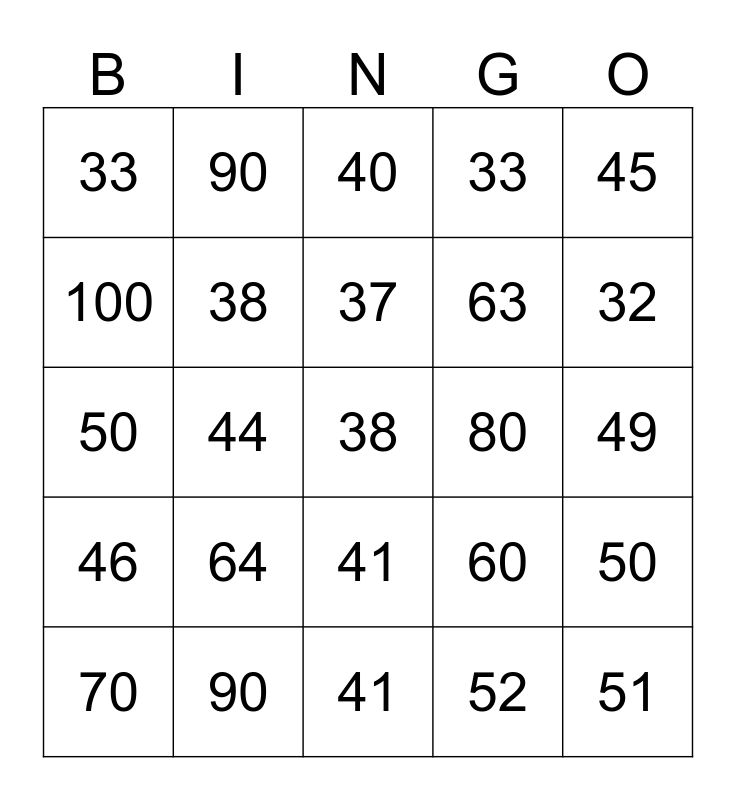 This bingo card has a free space and 24 words: 64, 90, 37, 70, 45, 33, 100, 90, 80, 41, 63, 50, 60, 50, 38, 52, 49, 40, 32, 44, 51, 46, 33 and 41.
