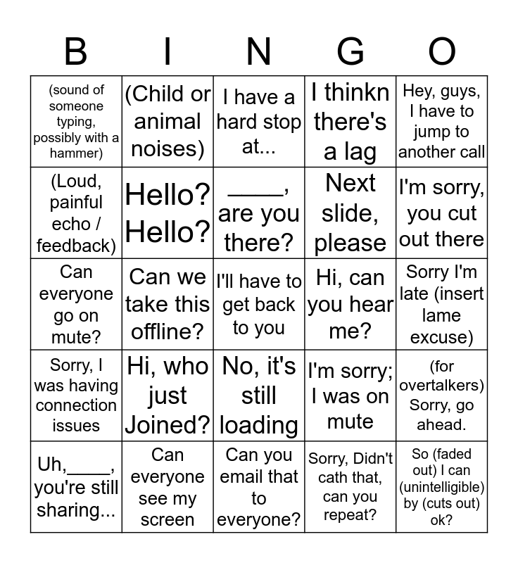 This bingo card has 25 words: Hi, who just Joined?, Can you email that to everyone?, ____, are you there?, Uh,____, you're still sharing..., Hey, guys, I have to jump to another call, (sound of someone typing, possibly with a hammer), (Loud, painful echo / feedback), (Child or animal noises), Hi, can you hear me?, No, it's still loading, Next slide, please, Can everyone go on mute?, I'm sorry; I was on mute, (for overtalkers) Sorry, go ahead., Hello? Hello?, So (faded out) I can (unintelligible) by (cuts out) ok?, Sorry I'm late (insert lame excuse), I have a hard stop at..., I'm sorry, you cut out there, Can we take this offline?, I'll have to get back to you, Can everyone see my screen, Sorry, I was having connection issues, I thinkn there's a lag and Sorry, Didn't cath that, can you repeat?.