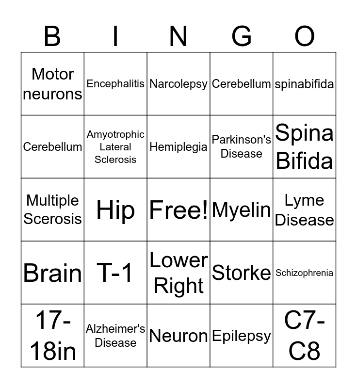 This bingo card has a free space and 24 words: T-1, Alzheimer's Disease, Hemiplegia, 17-18in, spinabifida, Motor neurons, Cerebellum, Encephalitis, Myelin, Lower Right, Parkinson's Disease, Multiple Scerosis, Storke, Schizophrenia, Amyotrophic Lateral Sclerosis, Epilepsy, Lyme Disease, Narcolepsy, Spina Bifida, Hip, C7-C8, Brain, Cerebellum and Neuron.