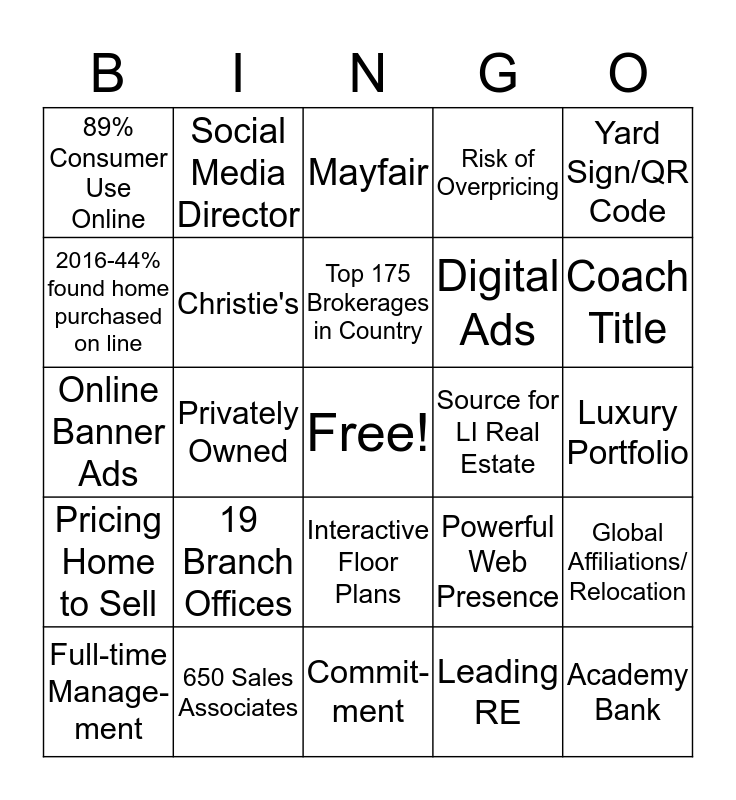 This bingo card has a free space and 24 words: 19 Branch Offices, 650 Sales Associates, Top 175 Brokerages in Country, Full-time Manage-ment, Yard Sign/QR Code, 89% Consumer Use Online, 2016-44% found home purchased on line, Social Media Director, Source for LI Real Estate, Interactive Floor Plans, Digital Ads, Online Banner Ads, Powerful Web Presence, Global Affiliations/ Relocation, Christie's, Leading RE, Luxury Portfolio, Mayfair, Coach Title, Privately Owned, Academy Bank, Pricing Home to Sell, Risk of Overpricing and Commit- ment.