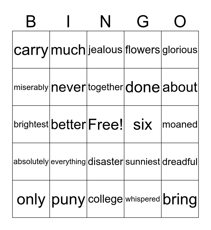 This bingo card has a free space and 24 words: everything, puny, together, only, glorious, carry, miserably, much, six, disaster, done, brightest, sunniest, dreadful, never, whispered, moaned, jealous, about, better, bring, absolutely, flowers and college.