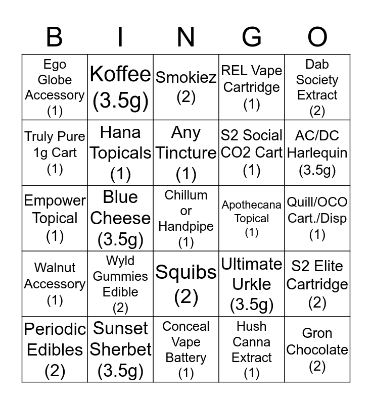 This bingo card has a free space and 24 words: Wyld Gummies Edible (2), Sunset Sherbet (3.5g), Any Tincture (1), Periodic Edibles (2), Dab Society Extract (2), Ego Globe Accessory (1), Truly Pure 1g Cart (1), Koffee (3.5g), Apothecana Topical (1), Squibs (2), S2 Social CO2 Cart (1), Empower Topical (1), Ultimate Urkle (3.5g), S2 Elite Cartridge (2), Hana Topicals (1), Hush Canna Extract (1), Quill/OCO Cart./Disp (1), Smokiez (2), AC/DC Harlequin (3.5g), Blue Cheese (3.5g), Gron Chocolate (2), Walnut Accessory (1), REL Vape Cartridge (1) and Conceal Vape Battery (1).