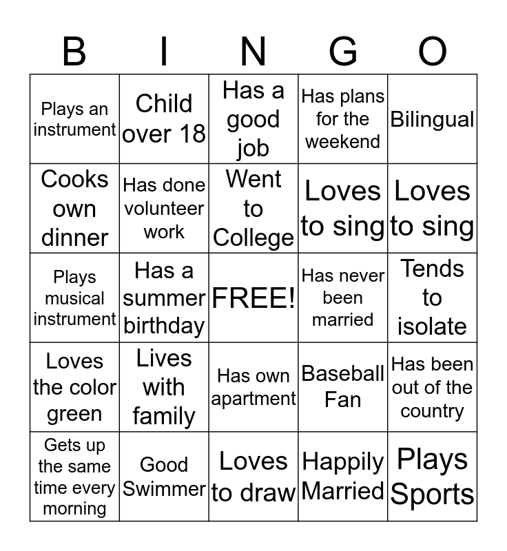 This bingo card has a free space and 24 words: Lives with family, Good Swimmer, Went to College, Gets up the same time every morning, Bilingual, Plays an instrument, Cooks own dinner, Child over 18, Has never been married, Has own apartment, Loves to sing, Plays musical instrument, Baseball Fan, Has been out of the country, Has done volunteer work, Happily Married, Tends to isolate, Has a good job, Loves to sing, Has a summer birthday, Plays Sports, Loves the color green, Has plans for the weekend and Loves to draw.