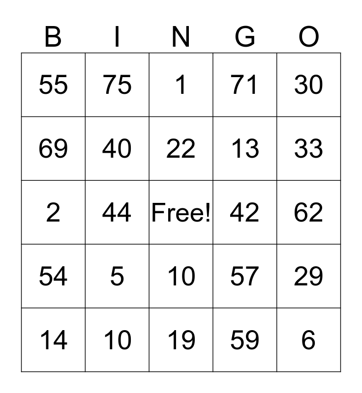 This bingo card has a free space and 24 words: 5, 10, 22, 14, 30, 55, 69, 75, 42, 10, 13, 2, 57, 29, 40, 59, 62, 1, 33, 44, 6, 54, 71 and 19.