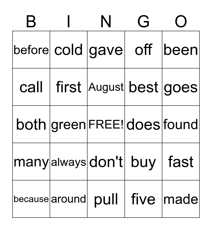 This bingo card has a free space and 24 words: always, around, August, because, been, before, call, cold, does, don't, best, both, buy, fast, first, five, found, gave, goes, green, made, many, off and pull.