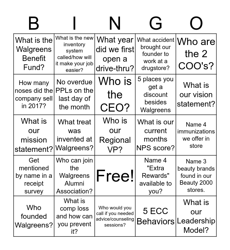 This bingo card has 26 words: Free!, 5 ECC Behaviors, Who is the CEO?, What is comp loss and how can you prevent it?, Who are the 2 COO's?, What is the Walgreens Benefit Fund?, How many noses did the company sell in 2017?, What is the new inventory system called/how will it make your job easier?, Name 4 immunizations we offer in store, Name 4 "Extra Rewards" available to you?, 5 places you get a discount besides Walgreens, What is our mission statement?, Name 3 beauty brands found in our Beauty 2000 stores., Who founded Walgreens?, What treat was invented at Walgreens?, Get mentioned by name in a receipt survey, What accident brought our founder to work at a drugstore?, Get mentioned by name in a receipt survey, What year did we first open a drive-thru?, Who is our Regional VP?, What is our vision statement?, Who would you call if you needed advice/counseling sessions?, What is our current months NPS score?, Who can join the Walgreens Alumni Association?, No overdue PPLs on the last day of the month and What is our Leadership Model?.