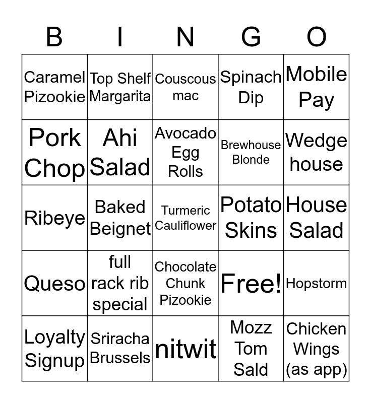 This bingo card has 25 words: full rack rib special, nitwit, Avocado Egg Rolls, Loyalty Signup, Mobile Pay, Caramel Pizookie, Pork Chop, Top Shelf Margarita, Potato Skins, Chocolate Chunk Pizookie, Brewhouse Blonde, Ribeye, Free!, Hopstorm, Ahi Salad, Chicken Wings (as app), House Salad, Couscous mac, Wedge house, Baked Beignet, Turmeric Cauliflower, Sriracha Brussels, Queso, Spinach Dip and Mozz Tom Sald.