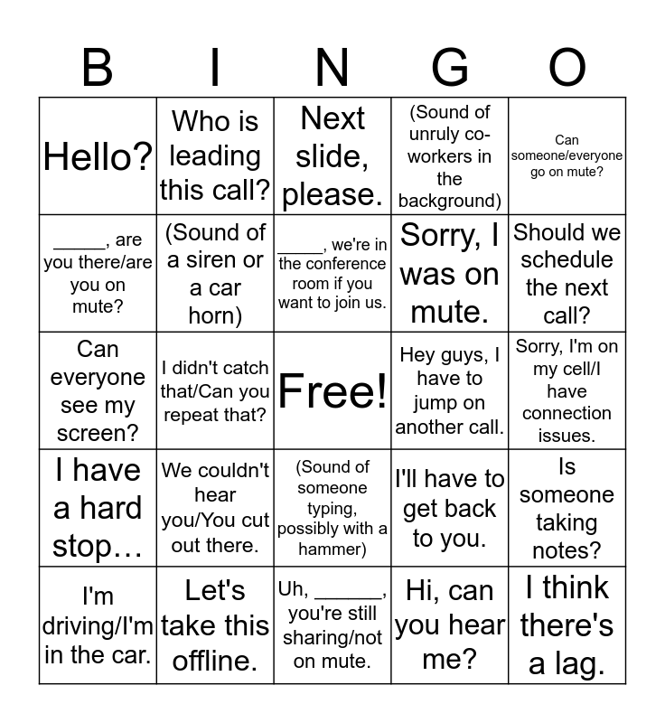 This bingo card has a free space and 35 words: (Child or animal noises), (For overtalkers) Sorry… go ahead., (Loud, painful echo or feedback), (Sound of a siren or a car horn), (Sound of someone typing, possibly with a hammer), (Sound of unruly co-workers in the background), _____, are you there/are you on mute?, _____, is on another call., _____, we're in the conference room if you want to join us., _____, will be late., Can everyone see my screen?, Can someone/everyone go on mute?, Can we just go back a minute?, Can you email that to everyone on the call?, Hello?, Hey guys, I have to jump on another call., Hi, can you hear me?, I didn't catch that/Can you repeat that?, I have a hard stop…, I think there's a lag., I'll have to get back to you., I'm driving/I'm in the car., Is someone taking notes?, Let's take this offline., Next slide, please., Should we schedule the next call?, So (fade out) I can (fade out) by (fade out), ok?, Sorry I'm late., Sorry, I was on mute., Sorry, I'm on my cell/I have connection issues., Thank you for joining., Uh, ______, you're still sharing/not on mute., We couldn't hear you/You cut out there., Who is leading this call? and Who just joined?.