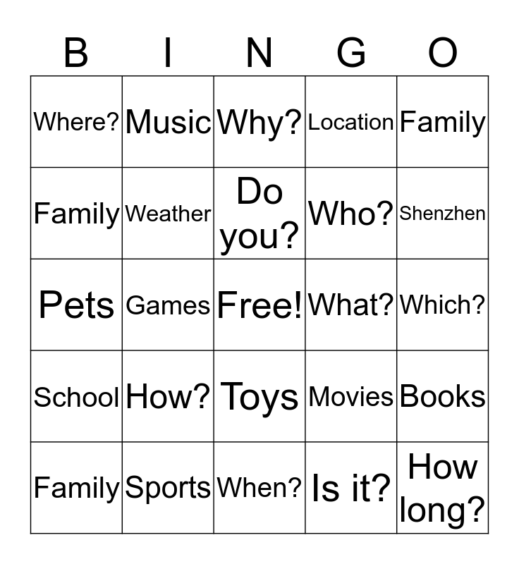 This bingo card has a free space and 24 words: Family, How?, Do you?, Is it?, Family, Where?, Music, Why?, What?, Which?, Pets, Weather, Movies, Books, Family, Sports, When?, Location, Shenzhen, School, Games, Toys, Who? and How long?.