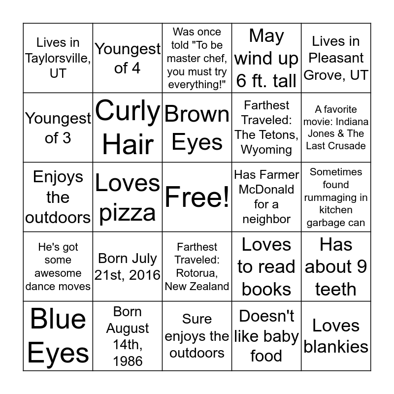 This bingo card has a free space and 24 words: Born July 21st, 2016, Born August 14th, 1986, Brown Eyes, Blue Eyes, Lives in Pleasant Grove, UT, Lives in Taylorsville, UT, Youngest of 3, Youngest of 4, Has Farmer McDonald for a neighbor, Farthest Traveled: Rotorua, New Zealand, Farthest Traveled: The Tetons, Wyoming, Enjoys the outdoors, Loves to read books, Has about 9 teeth, Curly Hair, Doesn't like baby food, Sometimes found rummaging in kitchen garbage can, Was once told "To be master chef, you must try everything!", A favorite movie: Indiana Jones & The Last Crusade, Loves pizza, Loves blankies, He's got some awesome dance moves, May wind up 6 ft. tall and Sure enjoys the outdoors.