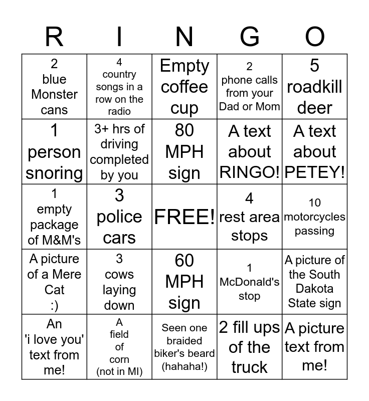 This bingo card has a free space and 24 words: 3 cows laying down, A field of corn (not in MI), 80 MPH sign, An 'i love you' text from me!, 5 roadkill deer, 2 blue Monster cans, 1 person snoring, 4 country songs in a row on the radio, 4 rest area stops, 60 MPH sign, A text about RINGO!, 1 empty package of M&M's, 1 McDonald's stop, A picture of the South Dakota State sign, 3+ hrs of driving completed by you, 2 fill ups of the truck, 10 motorcycles passing, Empty coffee cup, A text about PETEY!, 3 police cars, A picture text from me!, A picture of a Mere Cat :), 2 phone calls from your Dad or Mom and Seen one braided biker's beard (hahaha!).