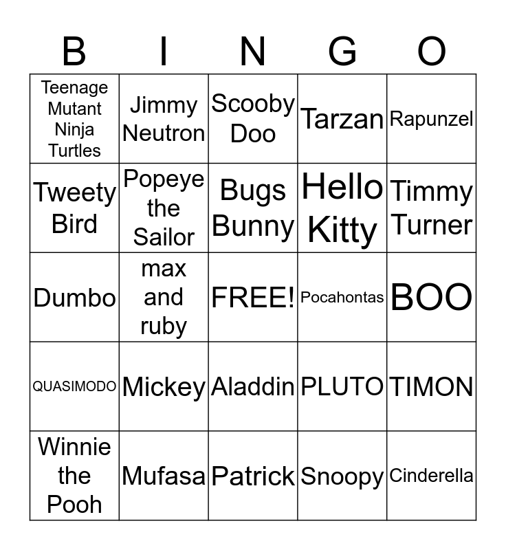 This bingo card has a free space and 44 words: Tom and Jerry, Cinderella, Tinker Bell, Winnie the Pooh, Tigger, Snoopy, Scooby Doo, Woody, Rapunzel, Mufasa, Tarzan, Pocahontas, Aladdin, Mickey, Spongebob, Patrick, Goofy, Dumbo, Bambi, Timmy Turner, Jimmy Neutron, Dora the Explorer, Diego, Teenage Mutant Ninja Turtles, ARIEL, BOO, ESMERALDA, GRUMPY, PLUTO, QUASIMODO, SEBASTIAN, TIMON, snow white, little bill, max and ruby, The Backyardigans, Simba, Buzz Lightyear, Bugs Bunny, Tweety Bird, Hello Kitty, Tasmanian Devil, Popeye the Sailor and Garfield.