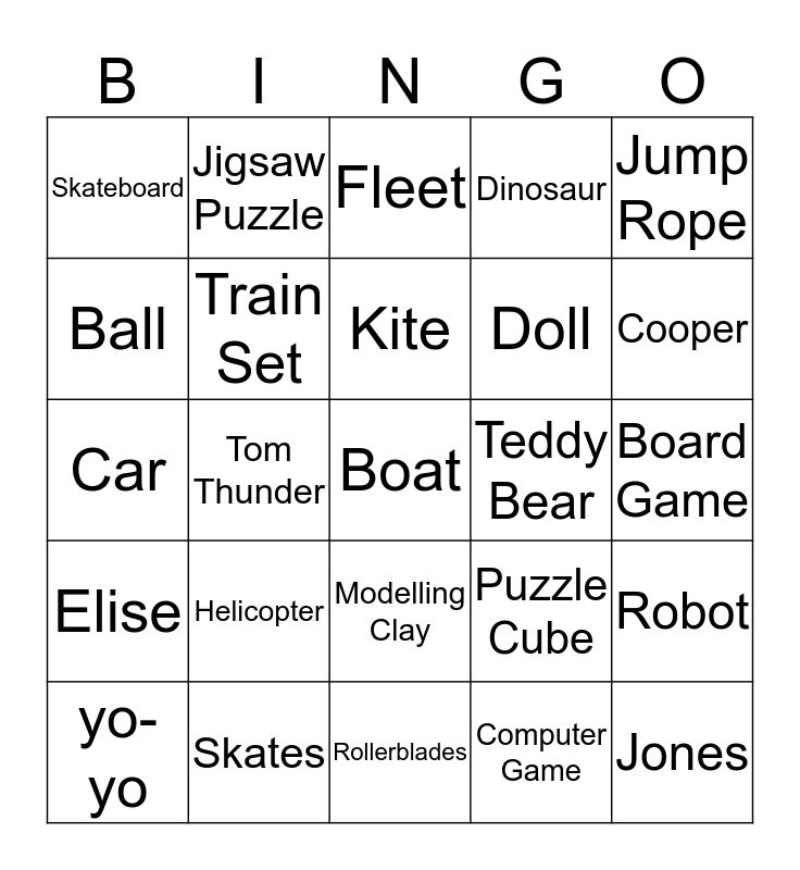 This bingo card has a free space and 24 words: Helicopter, Skates, Kite, yo-yo, Jump Rope, Skateboard, Ball, Jigsaw Puzzle, Teddy Bear, Modelling Clay, Doll, Car, Puzzle Cube, Robot, Train Set, Computer Game, Board Game, Fleet, Cooper, Tom Thunder, Jones, Elise, Dinosaur and Rollerblades.